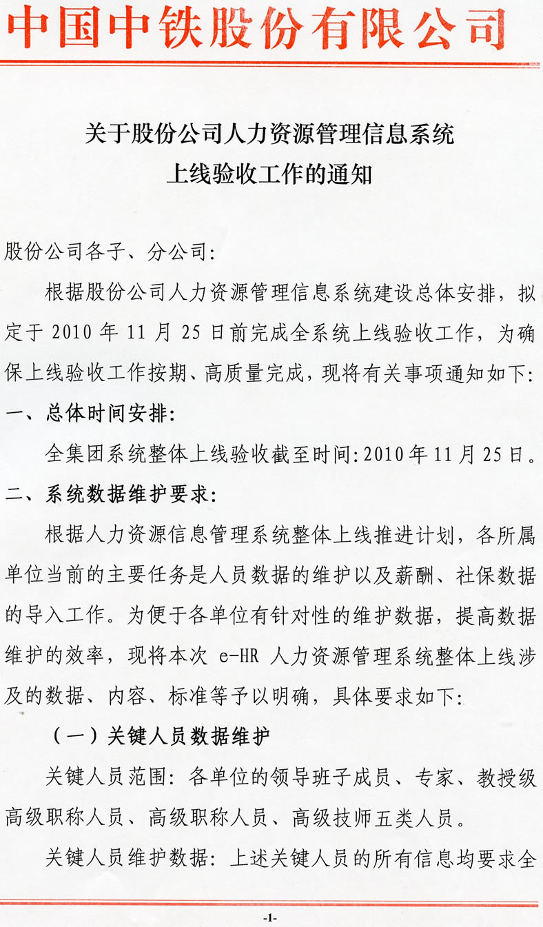 關(guān)于股份公司e-HR管理信息系統(tǒng)上線驗收工作的通知