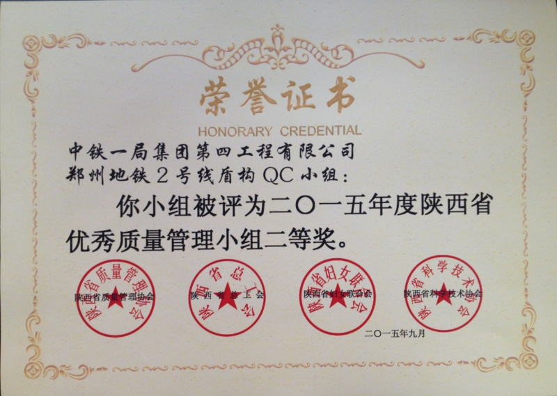 鄭州地鐵2號線盾構QC小組被評為2015年陜西省優秀質量管理小組二等... -