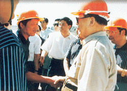 江澤民總書記視察中鐵一局修建南疆鐵路工程時(shí),與員工親切握手交談