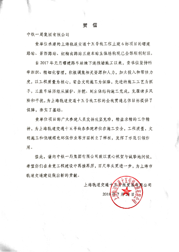7月28日,上海軌道交通十五號線發展有限公司向公司發來賀信,祝賀公司承建的上海軌道交通15號線工程土建6標項目曙建路站、景西路站、虹梅南路站三座車站主體結構全部順利封頂,為上海軌道交通十五號線工程的全線貫通總體目標提供了保障。