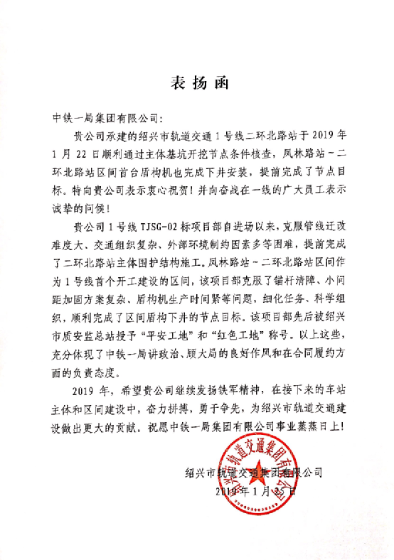 近日,紹興軌道交通集團向中鐵一局發來表揚信,表揚中鐵一局紹興地鐵1號線2標項目部順利通過主體基坑開挖節點條件核查,鳳林路站~二環北路站區間首臺盾構機完成下井安裝,提前完成了節點目標。