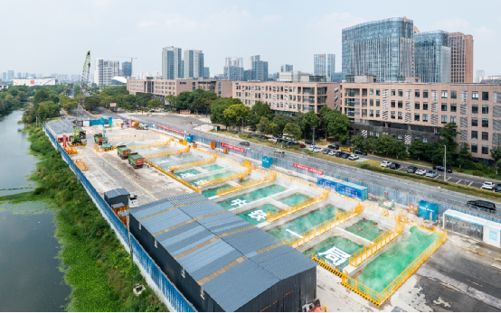 為了更好地控制現場揚塵、作業面溫度并做好車站主體結構養護,技術人員們為車站基坑量身定制了“水幕”系統。該系統整體采用數碼芯片控制,可以根據壓力信號自動運行,降低了開挖作業中產生的揚塵,改善基坑內部濕度環境,達到較好的養護效果。項目還增設了由計量系統、集排系統、循環系統、增壓系統和末端功能區等構成的井水收集及循環利用系統,讓整座車站的水循環利用。項目還創新采用了復合樹脂裝配式管溝及水溝、裝配式圍擋等措施,在達到標準化建設要求的同時,實現了良好的環保降碳效果。