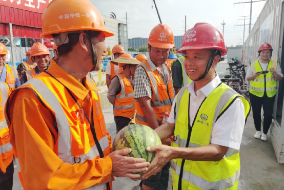 與會領導共同為一線作業工友送去了西瓜、鹽汽水等清涼物資及藿香正氣水、人丹等防暑禮包,將關懷送到了每個工友的手中。