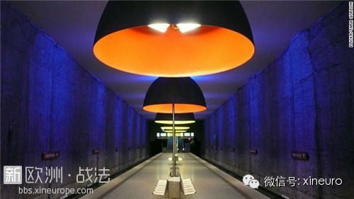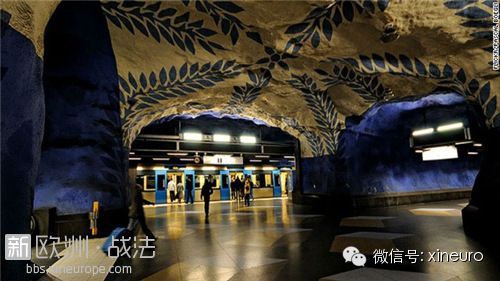 斯特哥爾摩的T-Centralen站位于地面。走進(jìn)里面,藍(lán)色和白色的天花板和溶洞似的月臺(tái)讓乘客感覺(jué)置身于地下世界。