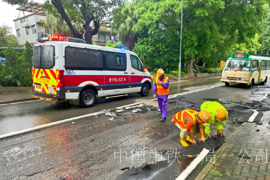 在得知多地因黑雨出現嚴重水浸和道路損毀后,項目立即啟動應急預案,30名精干救援人員,10輛工程車以及抽水機、發電機、水泵等專業設備組成的搶險救援隊,分組出發火速趕往元朗、荃灣、西貢、觀塘等重災區展開搶險工作。