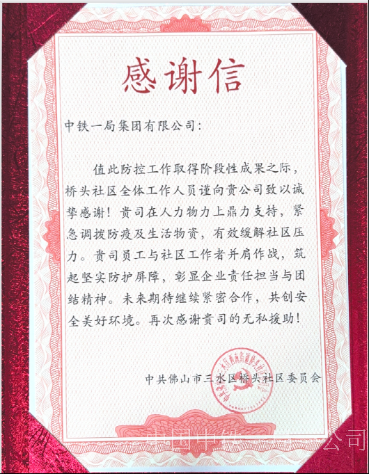 近日,中鐵一局佛北戰(zhàn)新數(shù)智城收到了來(lái)自佛山市三水區(qū)橋頭社區(qū)的一封感謝信,信中對(duì)項(xiàng)目部在基孔肯雅熱疫情防控期間給予社區(qū)的大力支持與幫助表達(dá)了誠(chéng)摯感謝。