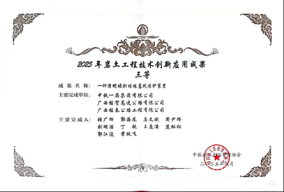 據(jù)介紹,桂鐘高速是廣西高速公路網(wǎng)中的“聯(lián)1”桂林-恭城-賀州高速公路的重要組成部分,為廣西經(jīng)濟社會平穩(wěn)較快發(fā)展提供交通保障。此次成果獲獎表明,桂鐘高速8標(biāo)項目始終秉持科技創(chuàng)新賦能生產(chǎn)的理念,通過持續(xù)鉆研及應(yīng)用“四新”技術(shù),提升生產(chǎn)效率、牢筑安全防線、優(yōu)化管理水平,促進項目高質(zhì)量發(fā)展。