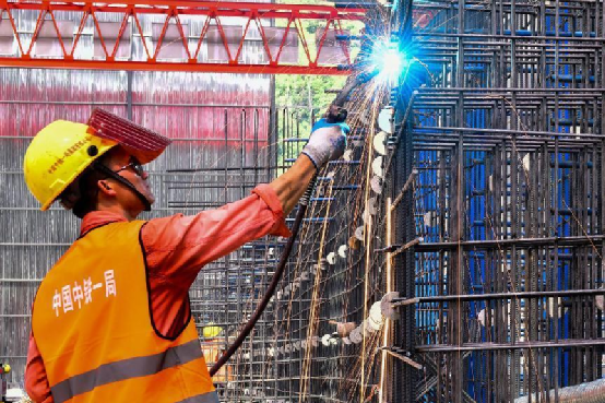 項目部按照施工進度,在全線建立了2座鋼筋加工廠,配備了數控鋼筋彎曲機、鋼筋籠自動滾焊、鋸切套絲打磨生產線、焊接機器人等滿足工地所需的機械設備;建立1座拌和站,配置12個200噸水泥罐,設置8個料倉,可預存料7000立方米,最大日產量近3000立方米。