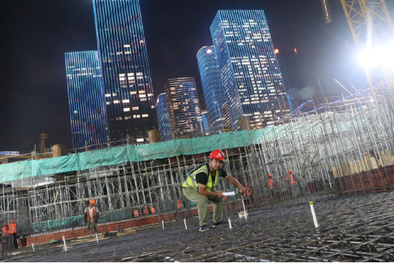 前海燈火輝煌的夜晚,也少不了交易廣場兄弟們的身影,瞧,李觀宇蹲著馬步正在測量保護層的厚度,測完后,背著包又轉身去準備混凝土澆筑前的工作了……這一趟轉眼就到天亮了。