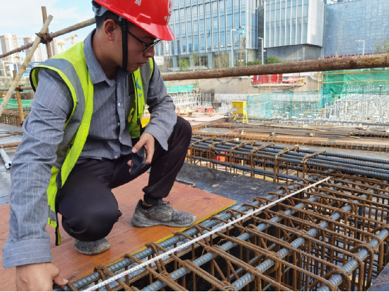 下午三點多烈日當空 太陽毒辣辣的,史勝男和監理方在板面自檢梁板鋼筋,汗水隨著黝黑的臉頰緩緩流下,淺藍色的工衣從后面看,背上已經濕了一大半了,“李工,你們這板筋搭接長度不夠,需要整改,還有腳下這一條梁下部鋼筋沒有綁扎,開側模綁扎”。“好吧,史工”。再給工隊負責人交代自檢過程中出現的問題,督促他們整改。整改完成后,通知監理驗收。覃穩拿了個吊錘在負一層給柱子做垂直度,只聽他在那喊著“上面多少,你不要問下面,你先說上面,下面有我看著,不要給我搞花里胡哨的,實事求是” 上面的工人說到:“上面23.6,下面呢。”“下面23.7,好,這個柱子沒有問題,下一個。”