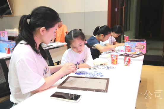 活動還為孩子們準備了非遺青花瓷貼畫手工制作,孩子們圍坐在桌前構思拼畫主題,他們拿起碎片,比對形狀和顏色后粘貼在畫板上。現場氛圍活躍,孩子們交流想法、分享挑到合適碎片的喜悅。遇到困難時,他們會向父母或伙伴請教,相互幫助完成作品。隨著時間推移,一幅幅充滿童趣的青花瓷碎片貼畫逐漸成形。