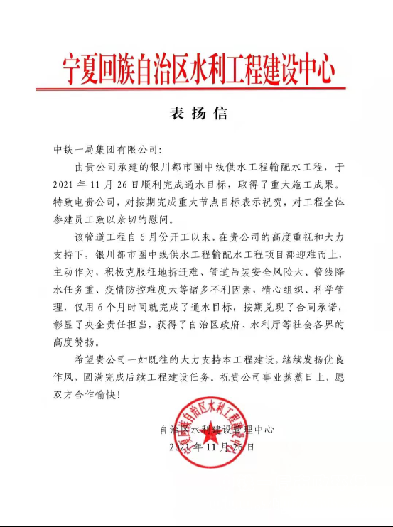 寧夏回族自治區(qū)水利工程建設中心表揚信