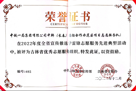 公司中韓(長春)國際合作示范區項目志愿服務隊榮獲“吉林省優秀志愿服務組織” 榮譽稱號