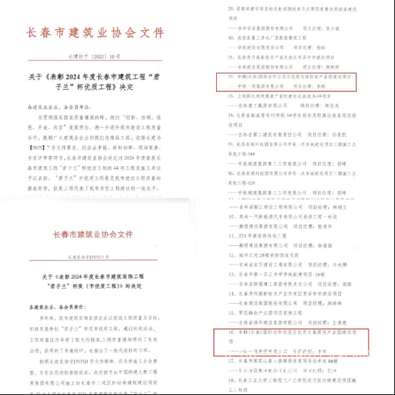 近日,長春市建筑業協會發布表彰決定,公司參建的中韓(長春)國際合作示范區優質文體促進產業園建設項目榮獲2024年度長春市建筑工程“君子蘭”杯優質工程獎和2024年度長春市建筑裝飾工程“君子蘭”杯獎。