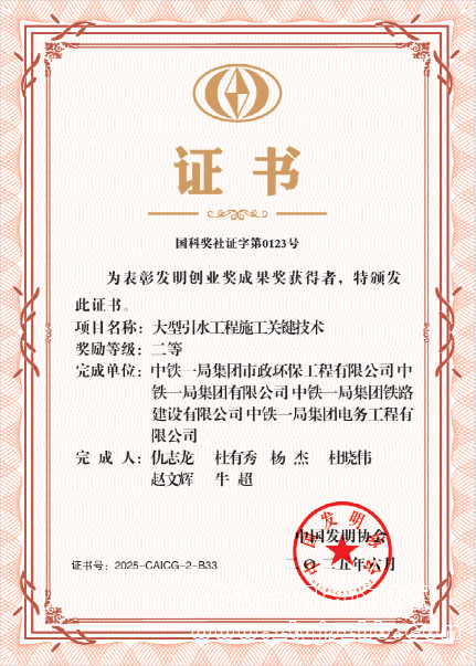 大型引水工程施工關(guān)鍵技術(shù)獲發(fā)明創(chuàng)業(yè)獎二等獎