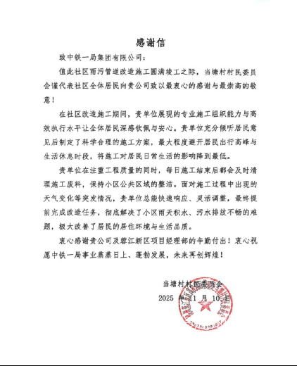 近日,中鐵一局贛州蓉江新區排水單元整治項目圓滿結束了當塘村的社區改造施工,當塘村村民委員會送來錦旗和感謝信,對項目在社區改造施工中的專業表現和辛勤付出表示感謝,并贊揚項目部的高效執行力與專業施工組織能力。