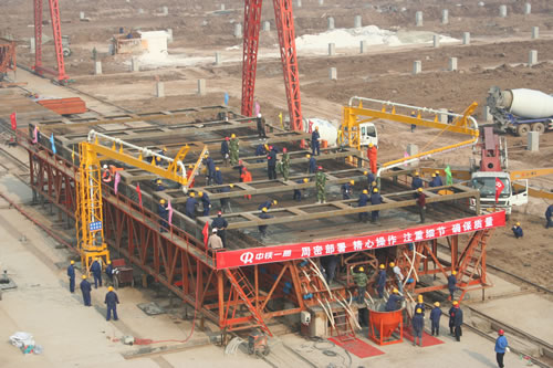 梁場先后舉辦了多期生產技術培訓班,采取放幻燈片,發放自編的學習資料,開辦座談會,知識競賽等多種有效形式,對全體員工進行了6次培訓,請外國咨詢橋梁專家海德先生到梁場親自授課,指導操作要點和注意事項,對投產前的準備工作進行細心安排,周密部署。2006年10月26日,鄭西客專臨潼制梁場舉行了首跨箱梁預制儀式。物貿公司董事長韓學軍、總經理陳強及公司其他領導始終堅守在現場指導施工。經過近8小時的緊張鏖戰,鄭西客專第一跨900噸箱梁終于預制成功。
