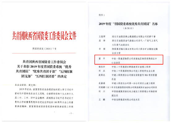 4月15日,省國資委團工委公布了《關于表彰2019年度省國資委系統“優秀共青團員”“優秀共青團干部”“五四紅旗團支部”“五四紅旗團委”的決定》(陜國資團發202007號),公司西南物供中心竇平被授予2019年度“陜西省優秀共青團員”稱號。