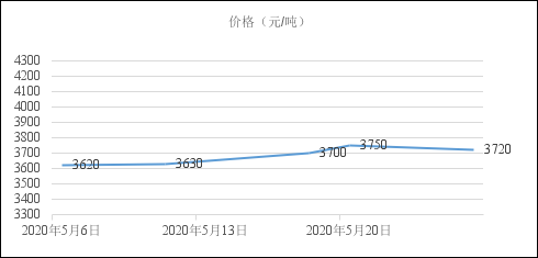 2020年5月份國內建筑鋼價震蕩上行,截止5月底,西本鋼材指數收在3810,較上月末上漲100元/噸。下圖為西安地區螺紋鋼HRB400EФ20mm價格走勢。